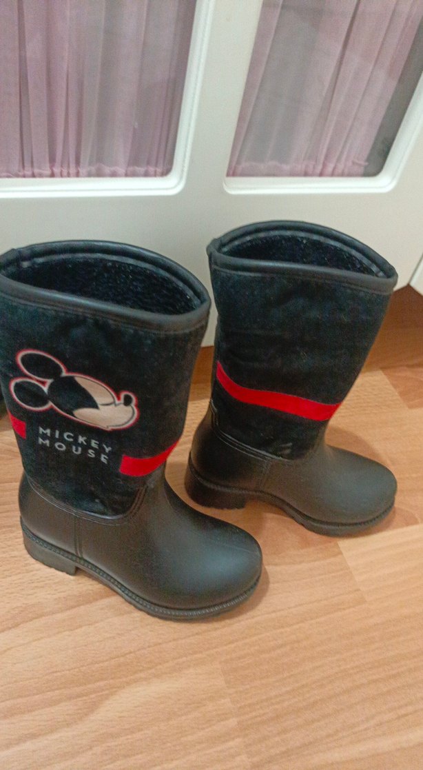 Kız çocukları için siyah kauçuk biker botlar, Mickey Mouse baskılı ve kırmızı şerit detaylıdır. Kolay kapanma için cırt cırtlıdır.