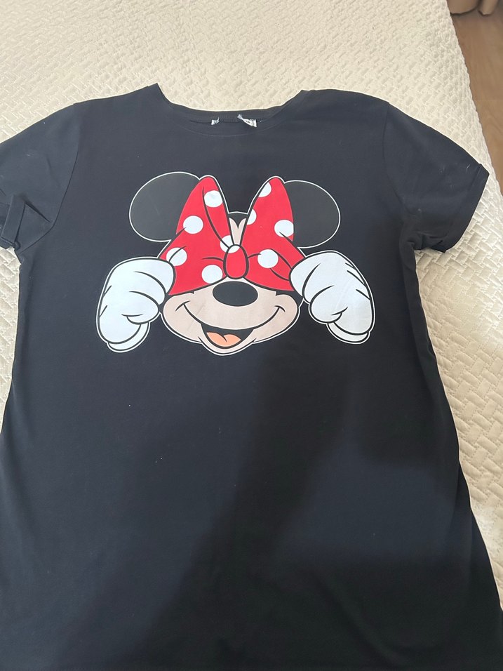 Kız çocukları için siyah, kısa kollu, bisiklet yaka ve baskılı Minnie Mouse figürlü tişört. Pürüzsüz sentetik kumaştan üretilmiştir.