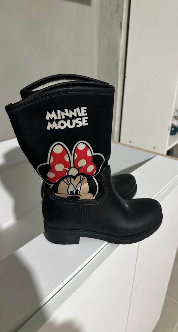 Kız çocuklar için siyah kauçuk biker bot, tokalı tasarım ve Minnie Mouse baskılı, rock punk tarzı için uygun.