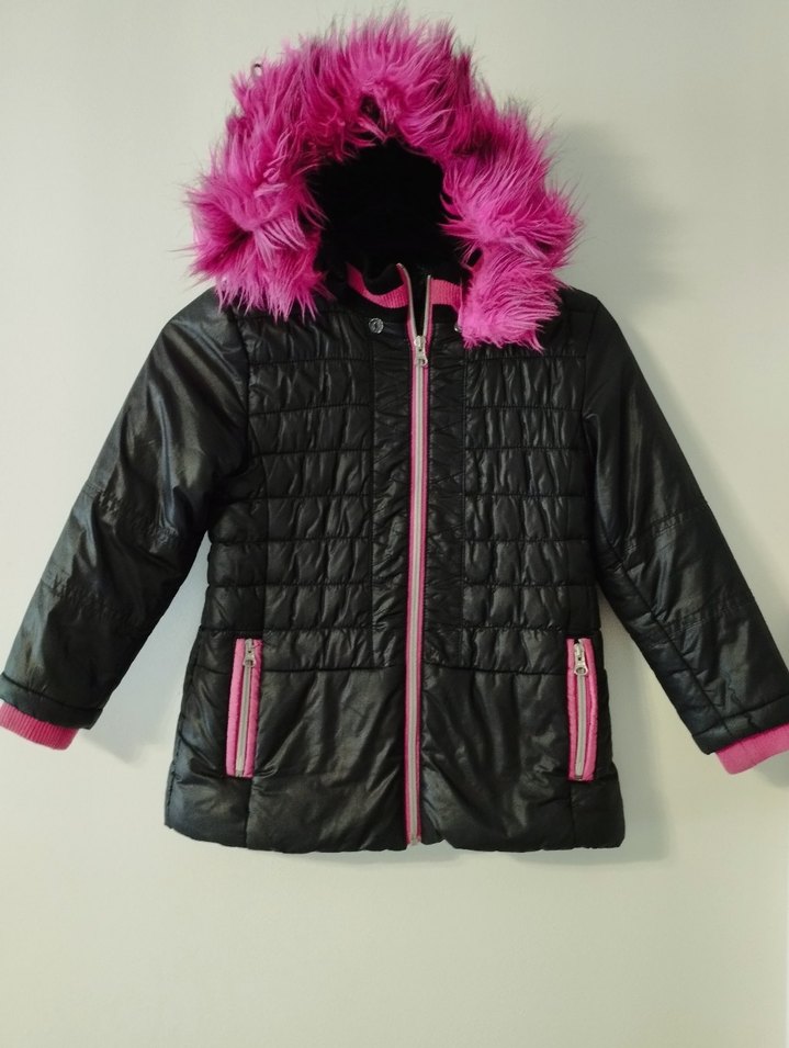 Barbie Kız çocuk 6 yaş mont, siyah kapitone desenli, pembe kürk detaylı kapüşonlu ve fermuarlı, fit kesim mont.isteğe göre kapşon çıkarılabilir