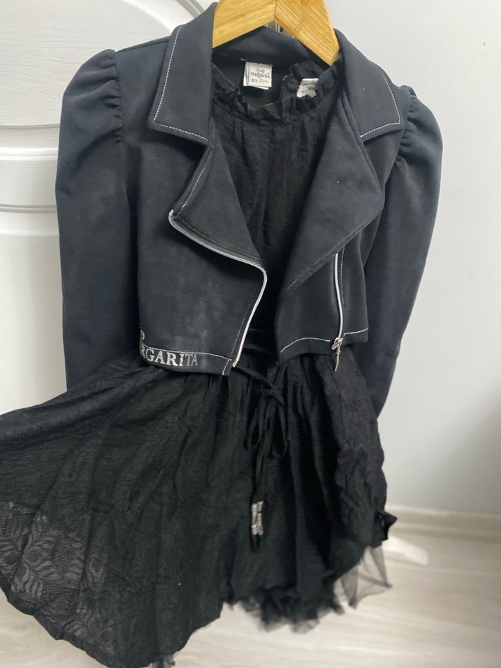 Fitted kesim siyah kadifemsi bolero, yakası kesik, askılı kolları ve fermuarlı Nakışlı detaylar ve etek ucunda "GARITA" yazısı bulunur.