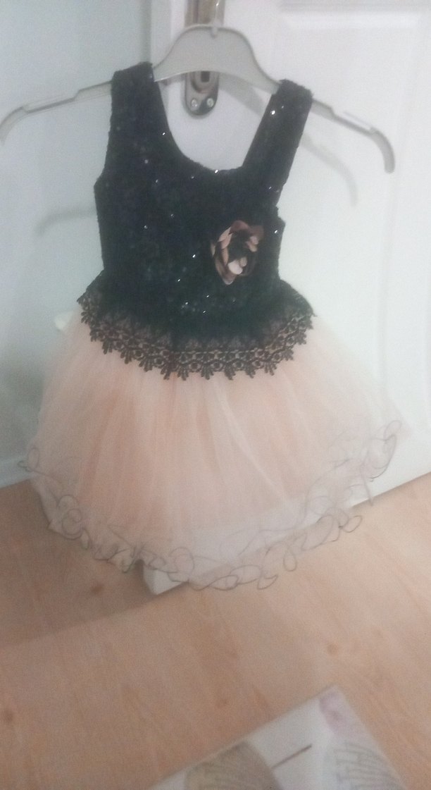 Kız çocuk için siyah nakışlı, kolsuz, tekne yaka, oturan üst kısmı olan elbise. Yumuşak şeftali tonunda katmanlı fırfırlı etek kısmı klasik zarafet sunar.