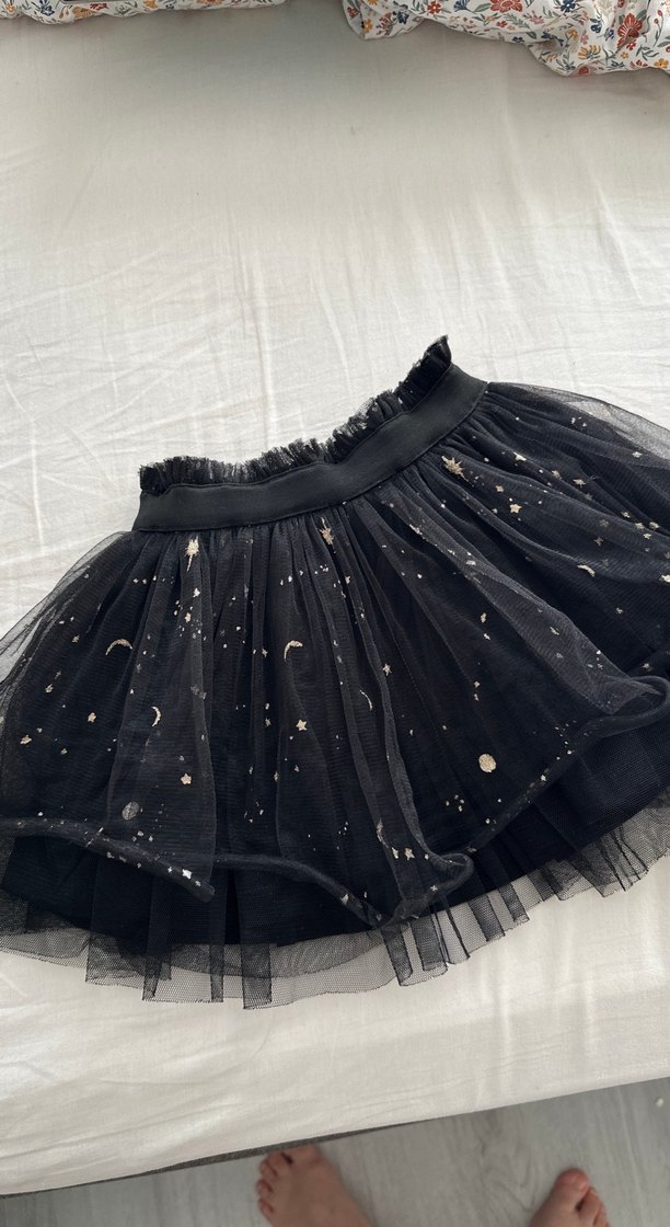 Siyah, nakışlı gökyüzü desenleri ve fırfır detaylı, rahat kesimli kız çocuk eteği, yumuşak sentetik kumaştan.
