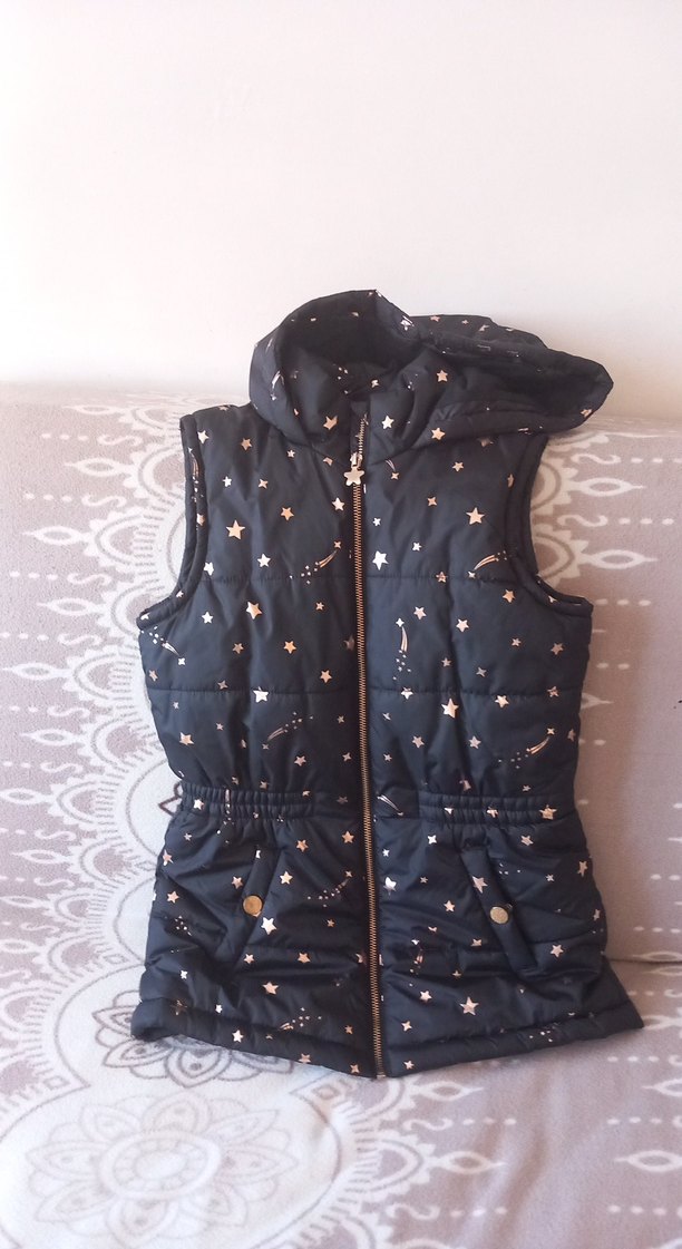 Siyah, kolsuz, nakışlı ve fermuarlı kız çocuk yeleği, dar kesim ve kayık yaka ile sokak modasına uygun.