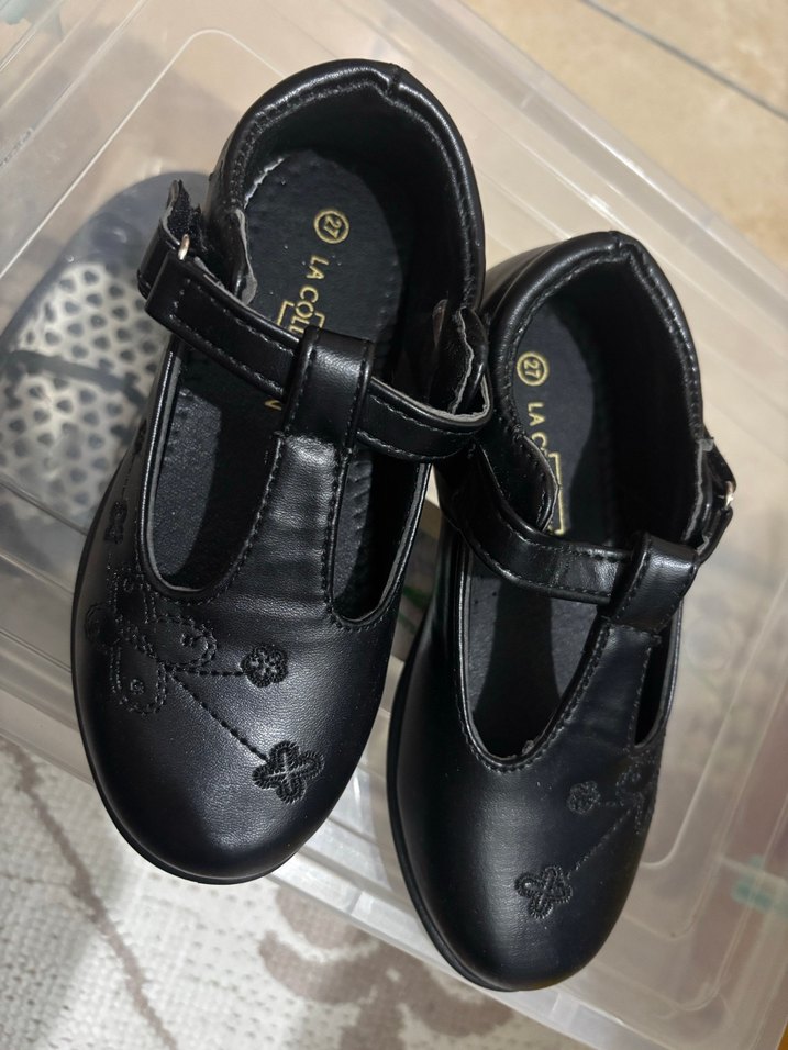 Siyah kız çocuk babetleri, nakışlı detaylı ve tokalı kayışlıdır, kauçuk malzemeden yapılmıştır. Ayakkabılarda koyu goth tarzı ve "LA" harfleri bulunur.
