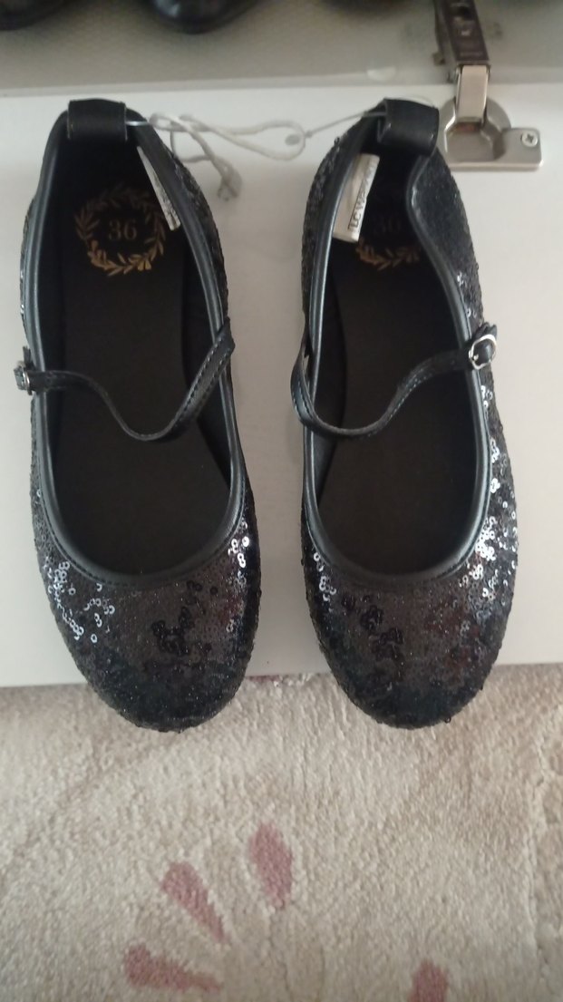 Kız çocukları için siyah nakışlı, tokalı bantlı, kauçuk babetler. Gotik tarzda klasik şıklık sunar.