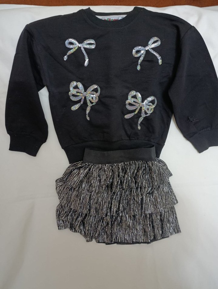 Siyah triko, uzun kollu ve nakışlı fiyonk desenlerine sahip kazak. Yuvarlak yaka ve bol kesim rahatlık sağlar, fırfırlı etekle tamamlanır. ✨