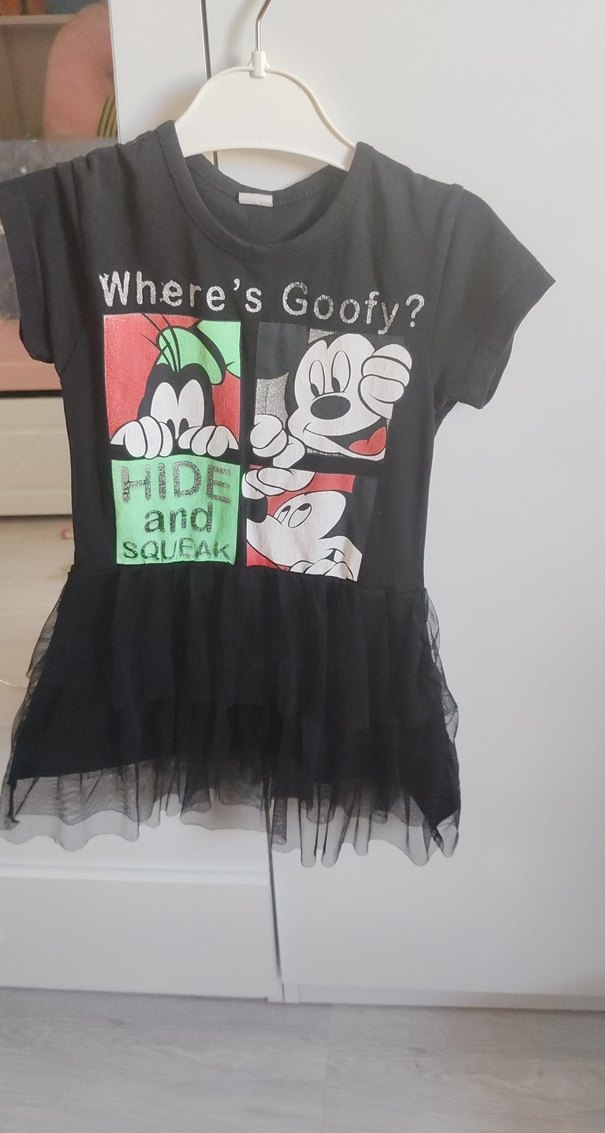 Siyah pamuklu tişört, kısa kollu ve bol kesimdir. 'Where's Goofy?' baskılı ve tül detaylı volanlı etek ucu ile gotik punk tarzı yansıtır.