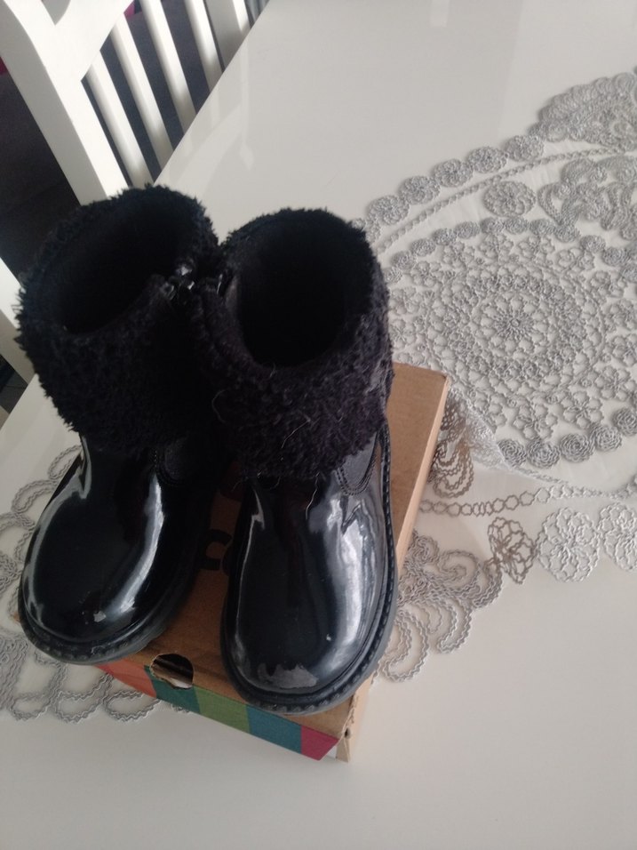 Parlak siyah kauçuk ve kürk detaylı kız çocuk botları, gotik tarzda şık ve trend belirleyici bir görünüm sunar.