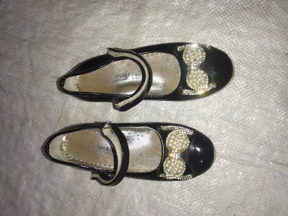 Kız çocukları için siyah parlak yüzeyli, payet ve işlemeli fiyonk detaylı klasik tarzda kauçuk babetler.