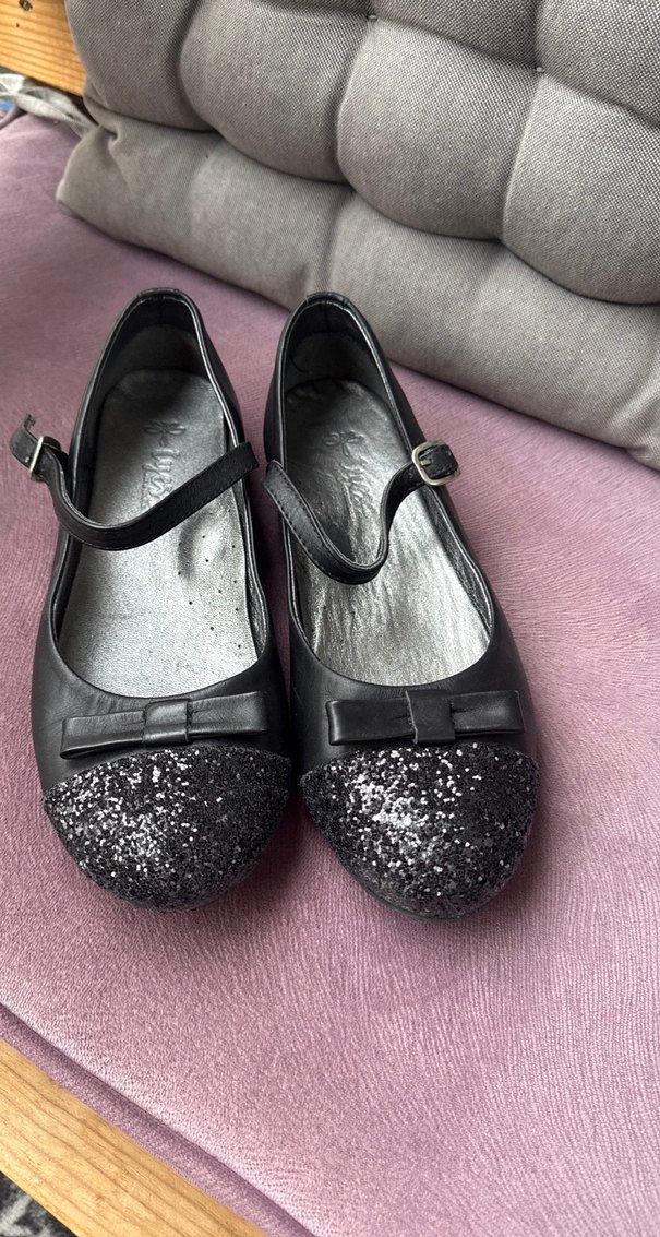 Kız çocukları için tokalı bantlı, parlak burunlu siyah kauçuk babetler. Gotik tarzda şık tasarım.