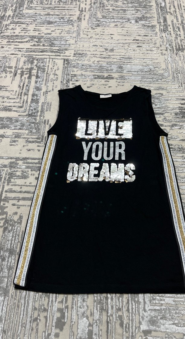 Siyah, kolsuz kız çocuk tişörtü, payetli "LIVE YOUR DREAMS" baskılı, bol kesim, yanları şerit detaylı. Sentetik kumaştan, straplez yaka. ✨