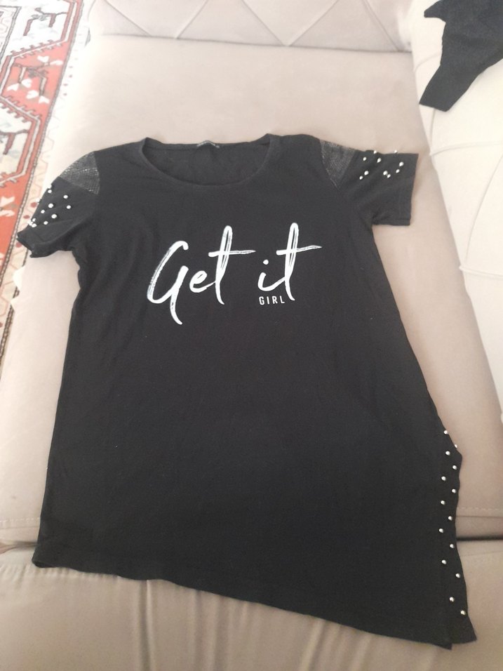 Pamuk kumaştan, kısa kollu, payet detaylı siyah tişört. Önünde 'Get it' baskısı ve rahat kesimi bulunur. ✨