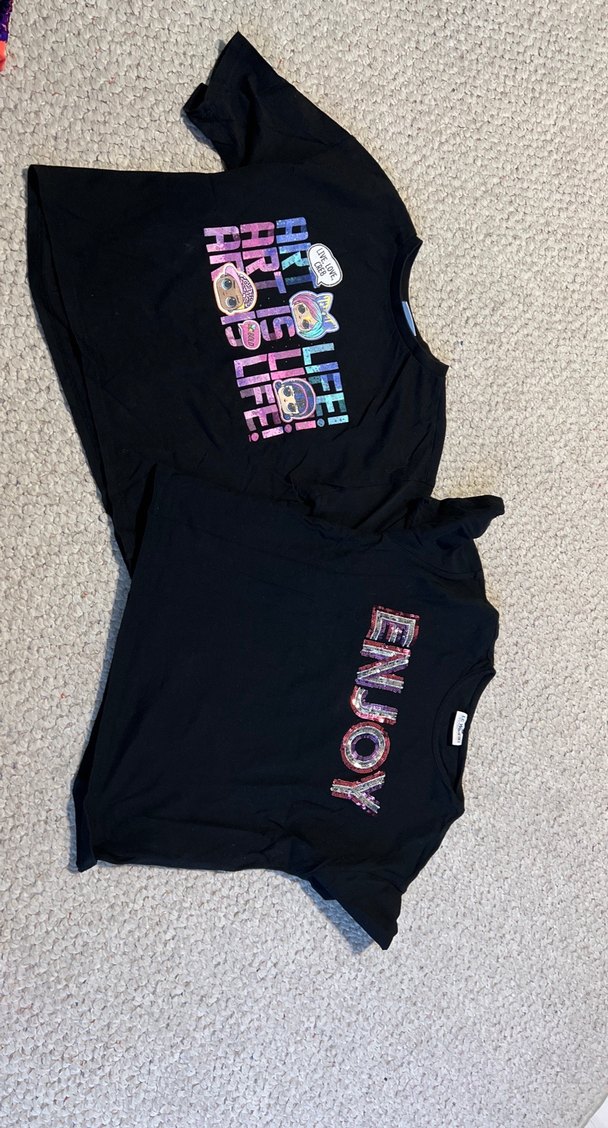 Siyah pamuklu kız çocuk tişörtü, kısa kollu ve bol kesimdir. Önünde baskı ve payetli "ENJOY" yazısı bulunur, sokak modasına uygundur.