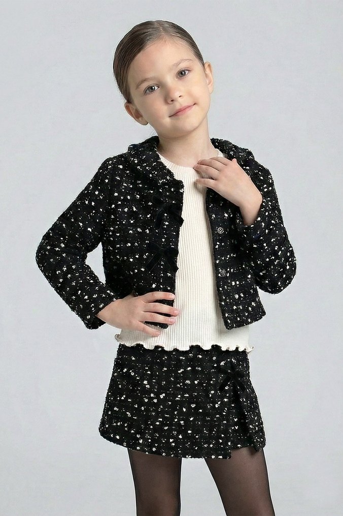 Kız çocukları için siyah, payetli ve puantiyeli, uzun kollu, yakası kesimli, sentetik kumaştan yapılmış dar kesim bolero ve etek ✨