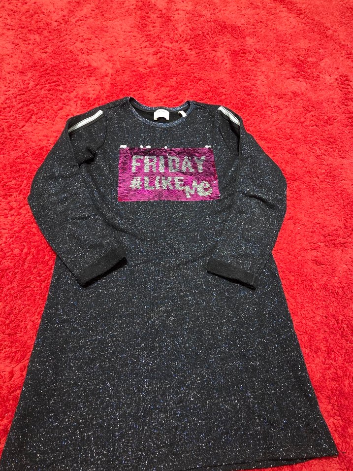 Kız çocukları için siyah, uzun kollu, bol kesim ve yumuşak kumaşlı payetli 'FRBDAY' baskılı elbise. Bisiklet yaka ve sokak modası tarzında. ✨