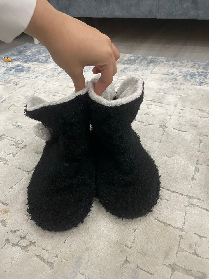 Kız çocukları için siyah, peluş detaylı ve sıcak tutan ev terlikleri, içi yumuşak ve konforludur. Resimde görüldüğü gibidir biraz eskidir çekmece de olduğu için dik durmuyor üzerinde eşyalar oldupu için 38 numara giyenede olur