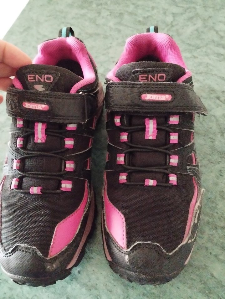 Kız çocukları için Velcro bantlı, pembe detaylı siyah-pembe renkli biker tarzı spor ayakkabılar. Kauçuk tabanlı, renkli ve desen içermeyen tasarım.