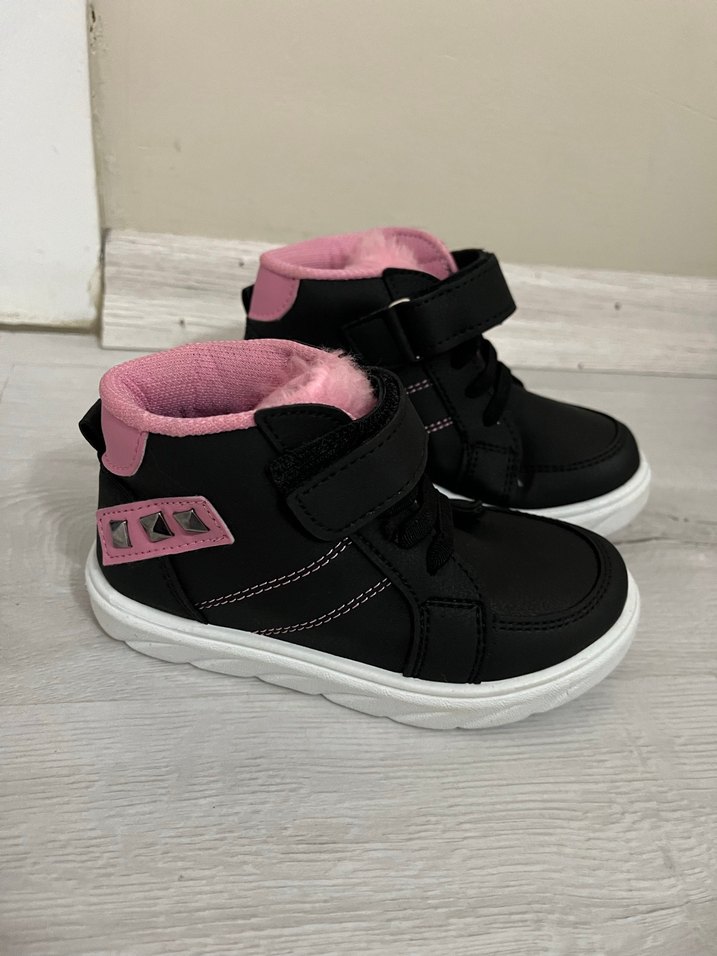 Hiç kullanılmadı. Kız çocukları için siyah ve koyu pembe renklerde, lastik malzemeden, baskılı desenli ve cırt cırtlı pratik botlar.