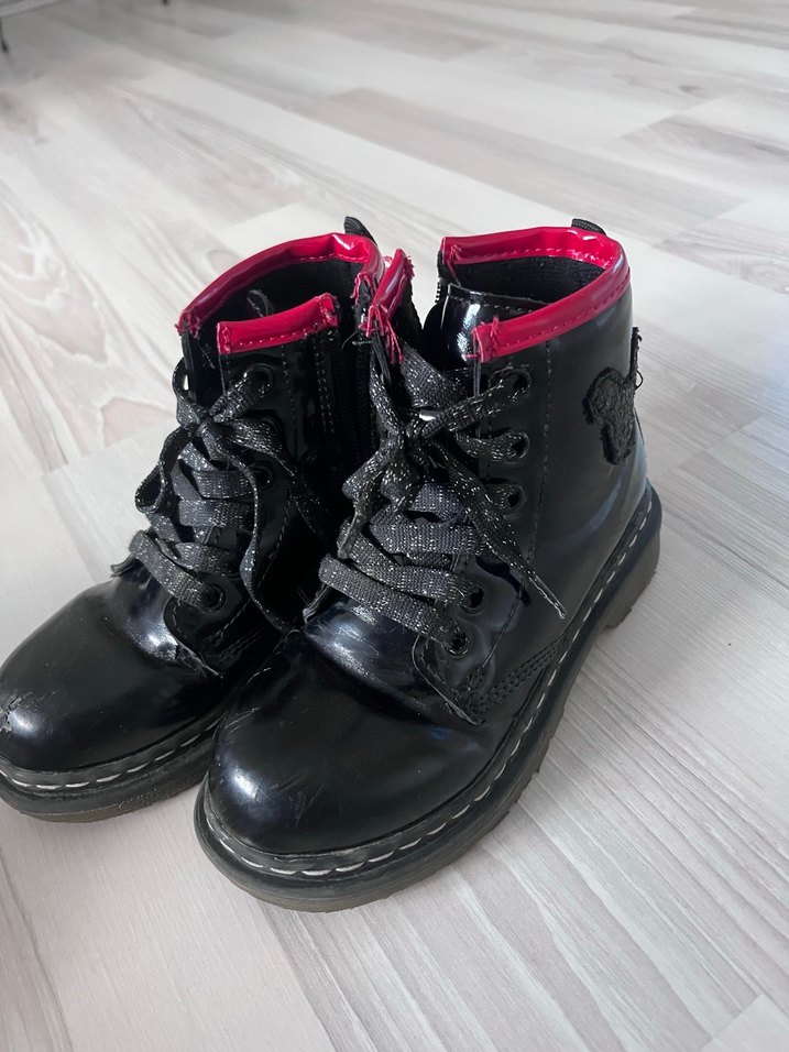 Koyu pembe ve siyah renkte, lastik malzemeden yapılmış, tokalı goth kız çocuk botları. Bağcıklı ve yan fermuarlı, rock punk tarzına uygun.