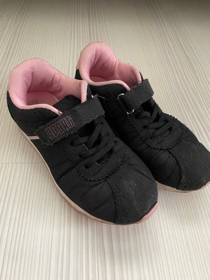 Siyah ve pembe renklerde, lastik tabanlı kız çocuk spor ayakkabısı. Kolay giyilmesi için cırt cırtlı kapama özelliğine sahiptir.