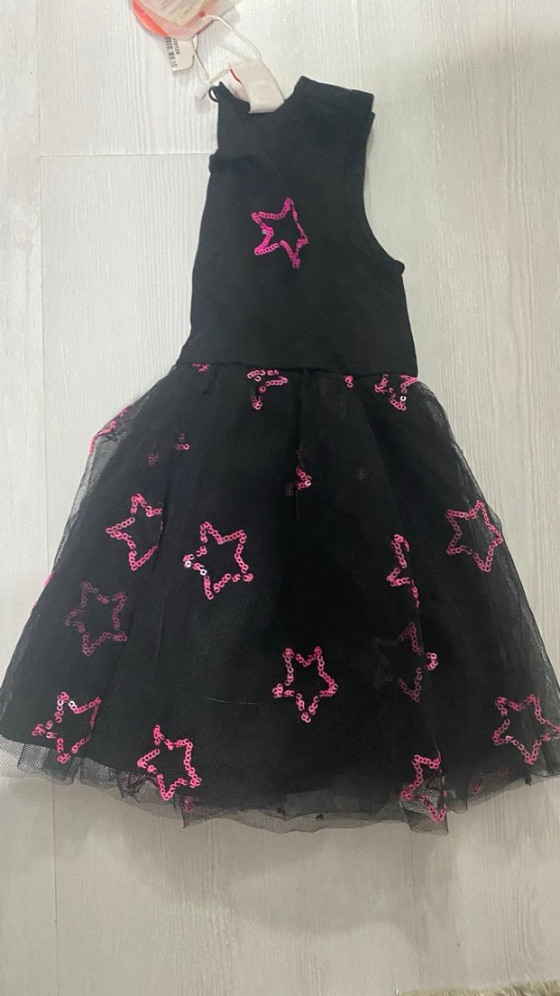 Kız çocuk için straplez, kolsuz, fitted kesim elbise. Sentetik kumaştan, siyah zemin üzerine pembe nakışlı yıldız desenleri ve fırfır detaylar bulunur.