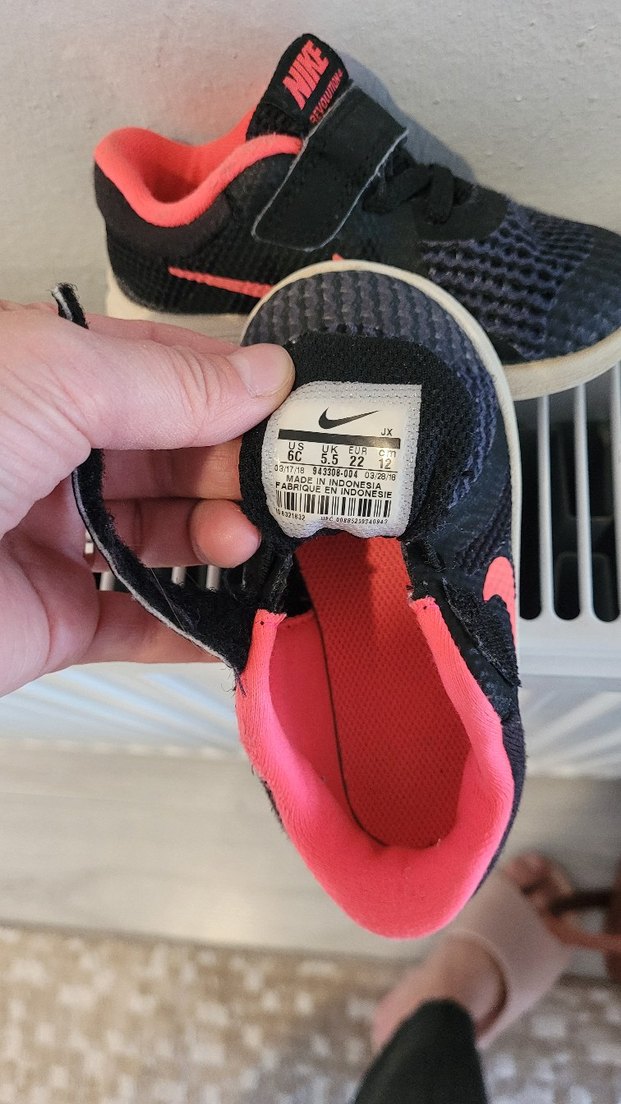 Kız çocuklar için siyah-pembe renklerde, baskılı desenli Nike spor ayakkabılar. Cırt cırtlı kapanışı ve kauçuk tabanı ile sokak stili için uygun.