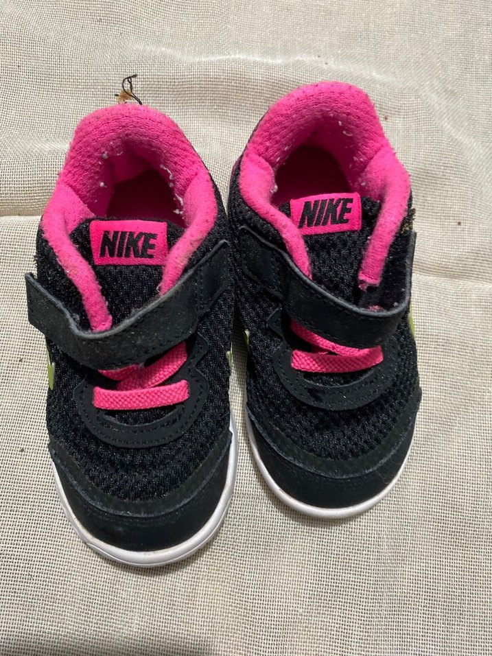 Kız çocukları için koyu renkli tie-dye desenli, pembe detaylı, cırt cırtlı Nike spor ayakkabısı. Kauçuk tabanlı ve rahat tasarımlı.