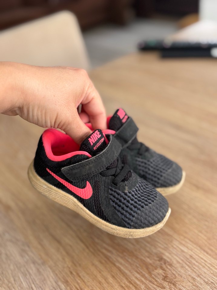 Kız çocukları için siyah ve pembe renklerde, kauçuk tabanlı ve cırt cırtlı Nike spor ayakkabı. Yıkanınca mis gibi olacaktır.