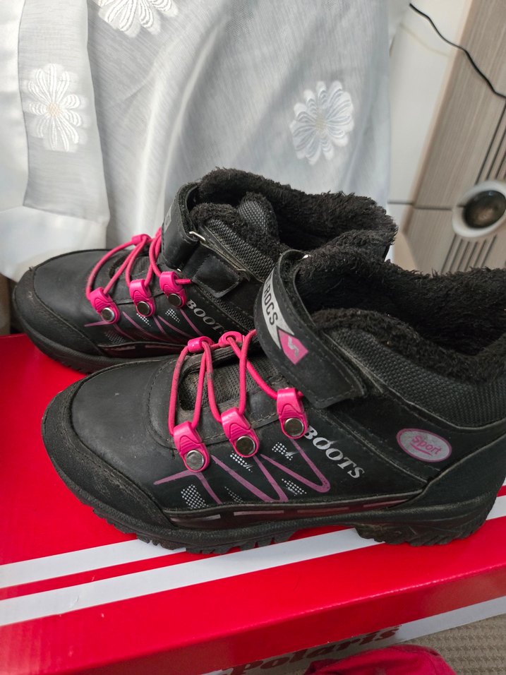 Kız çocukları için siyah-pembe renkli, renkli desenli, cırt cırtlı kauçuk bot. Sokak modası ve punk tarzını bir araya getirir.