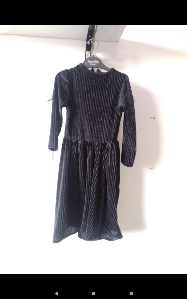 Uzun kollu, yuvarlak yaka ve piliseli detaylara sahip, siyah renkli sentetik kumaştan yapılmış rahat kesim kız çocuk goth elbisesi.