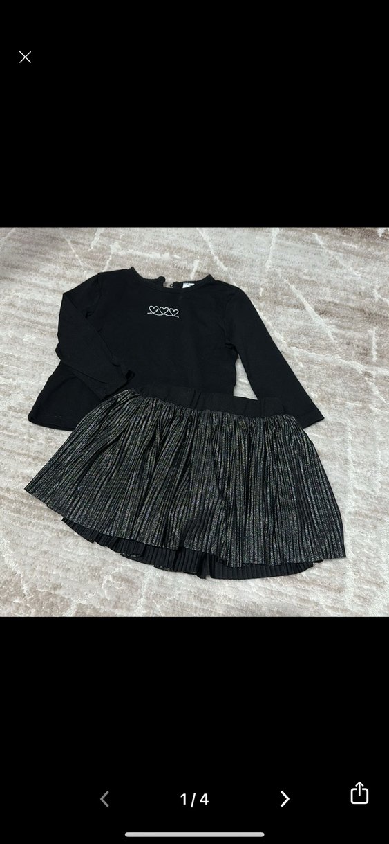 Kız çocuk için siyah, uzun kollu, yuvarlak yakalı, nakışlı kalpli desenlere sahip piliseli etekli rahat kesim elbise. Sentetik kumaştan yapılmıştır.