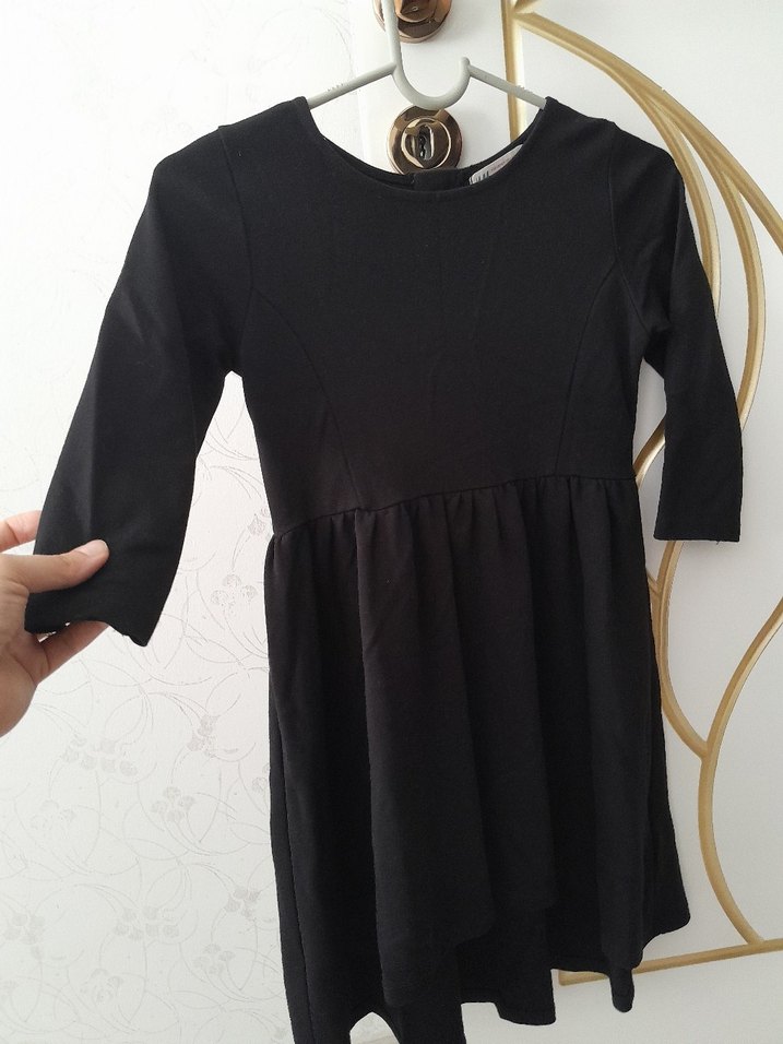 Kız çocukları için uzun kollu, bisiklet yaka ve piliseli etek detaylı siyah elbise, düz ve şık tasarıma sahip.