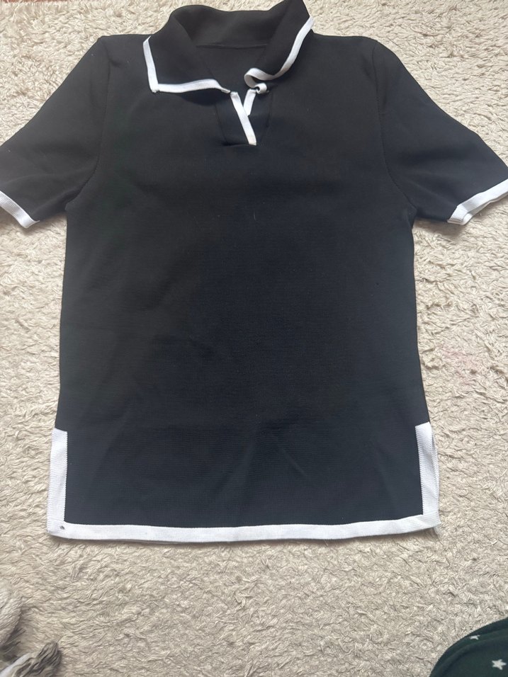 Siyah renkli kız çocuk polo tişört, yakalı ve kısa kollu, dar kesim ve şık sokak stili, yumuşak sentetik kumaştan yapılmıştır. S m l için uygundur