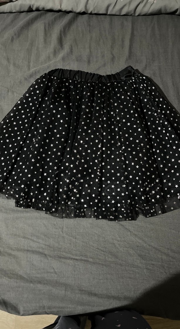 Fırfırlı detaylı, siyah puantiyeli ve dar kesim kız çocuk eteği, yumuşak sentetik kumaştan yapılmıştır.