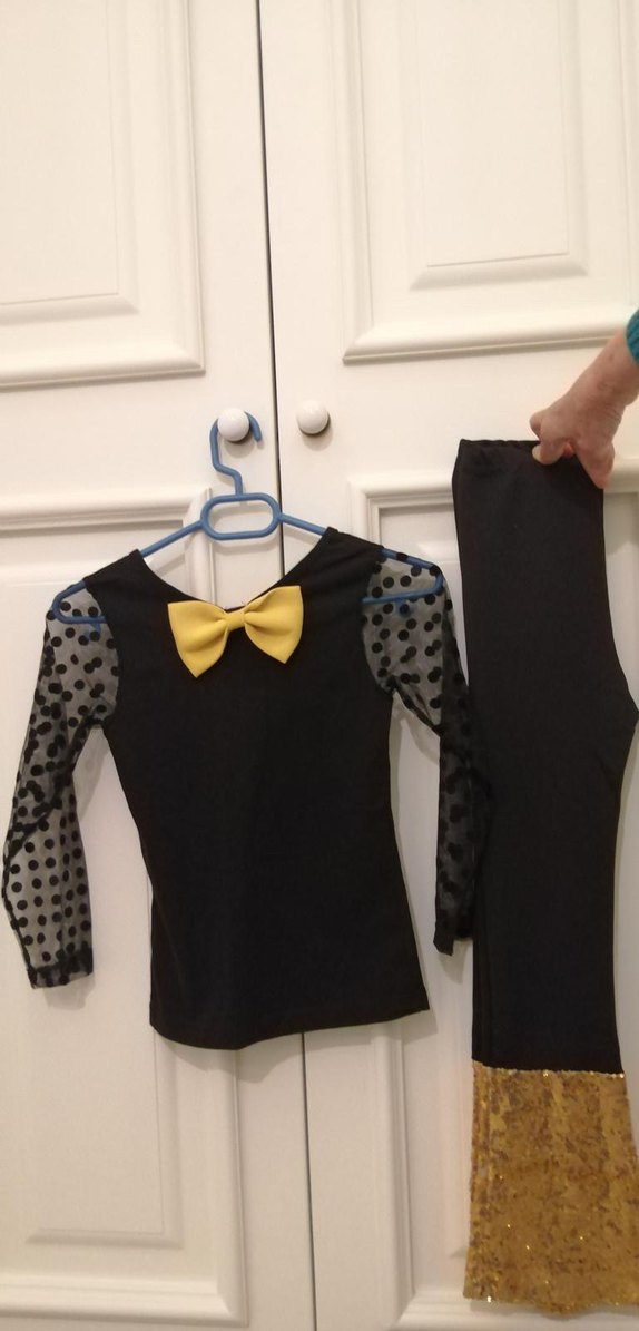 Dar kesim siyah çocuk takımı, uzun puantiyeli kollu ve crew yakalı, sarı fiyonk detayıyla gotik ve şık tarz sunar.