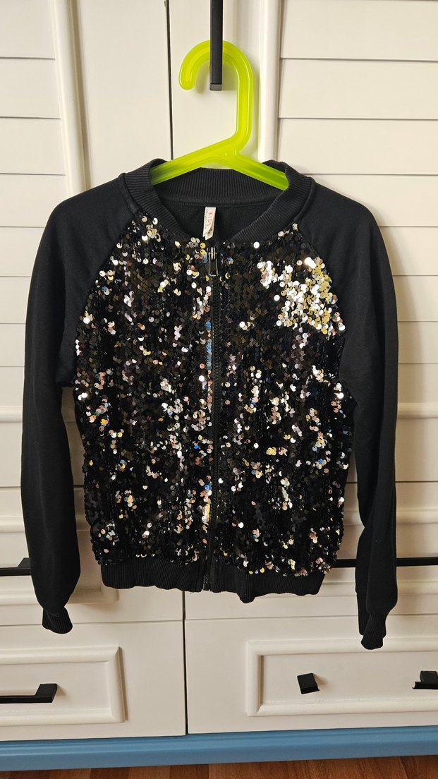 Kız çocuk siyah, pul payetli, fitted kesim ceket. Ön kısmı payetlerle süslenmiş, yumuşak kumaştan, bisiklet yaka ve sokak modası tarzında. ✨ 7-8 yas