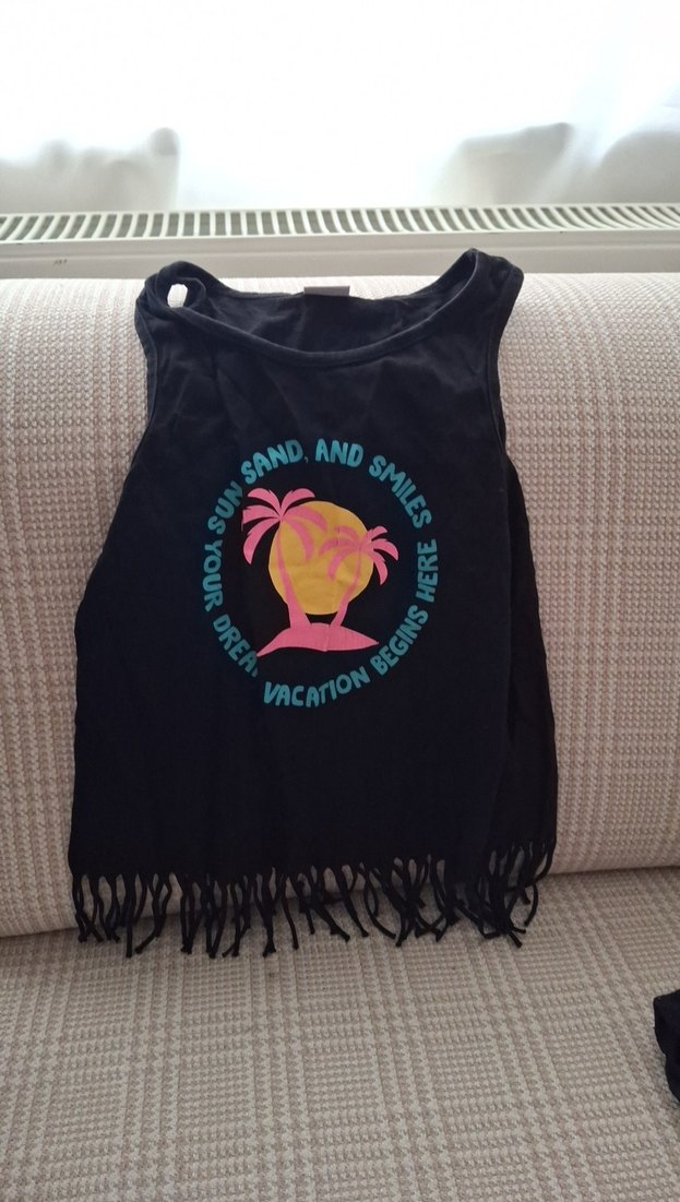 Siyah, pamuklu, kolsuz, bol kesim ve yuvarlak yakalı kız çocuk tişörtü. Renkli baskı ve etek kısmında püskül detayları bulunur.