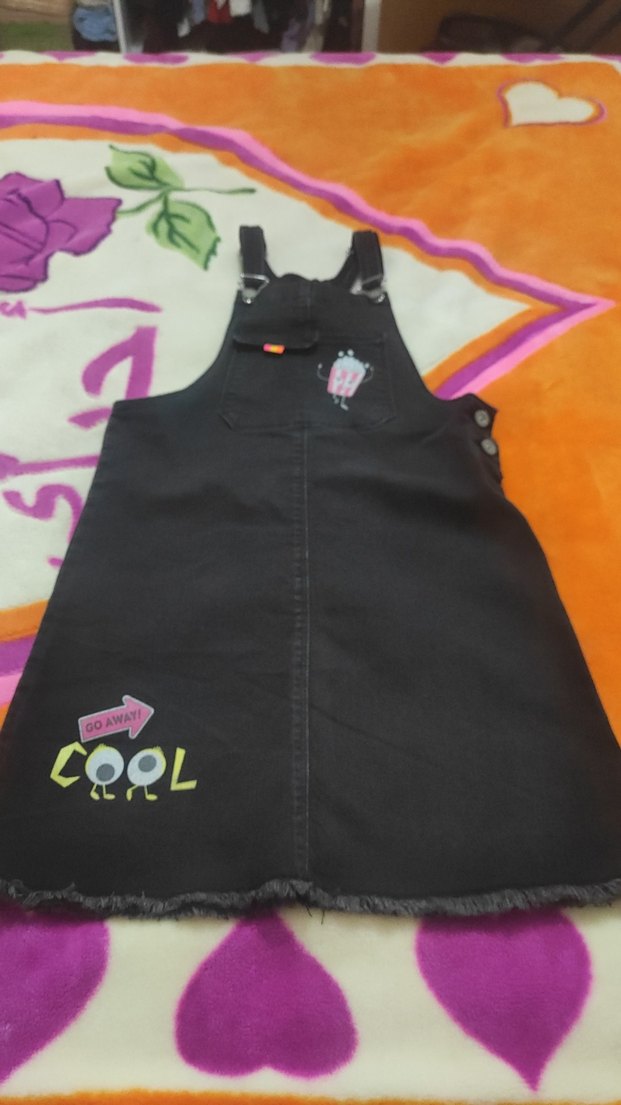 Siyah renkli, baskılı kız çocuk askılı elbise, sentetik kumaştan, bol kesim ve kolsuz. Kolay giyim için cırt cırtlı, sokak stili.