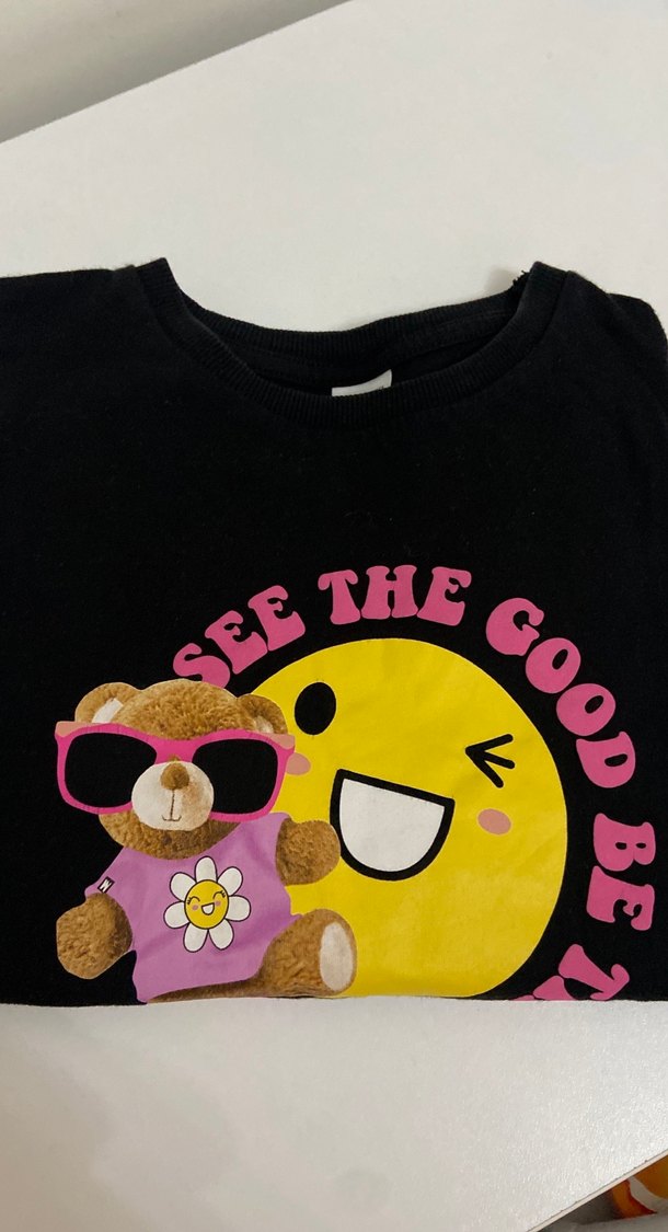Hiçbir yırtığı lekesi yok ince swit. Yumuşak, sıcak kumaştan yapılmış, bol kesim kız çocuk tişörtü. Yuvarlak yaka ve kısa kolludur. Parlak baskılı ayıcık ve gülen yüz motifi bulunur.