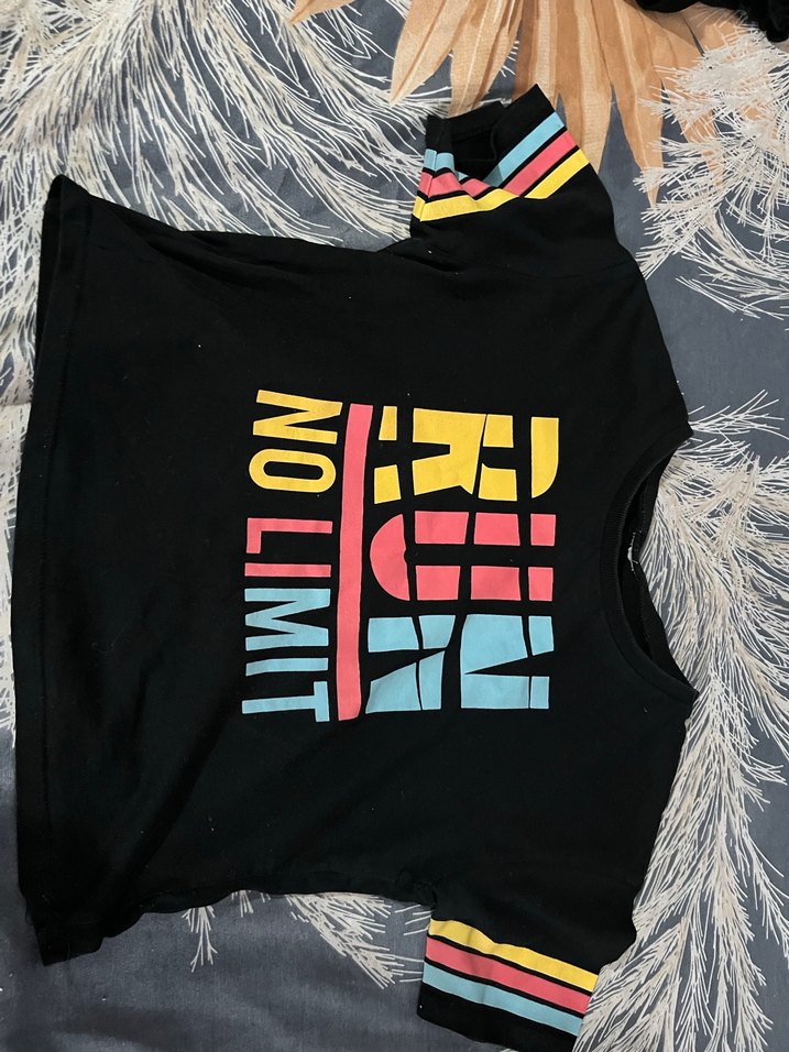 Bol kesim kız çocuk tişörtü, yuvarlak yaka ve kısa kolludur. Kollarında renkli çizgiler ve önünde 'RUN NO LIMIT' baskısı bulunur. ♀️