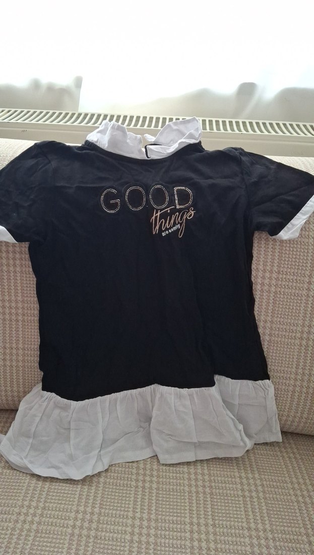 Kız çocuk siyah pamuk elbise, kısa kollu ve bol kesimdir. Yüksek yakada fırfır detaylı