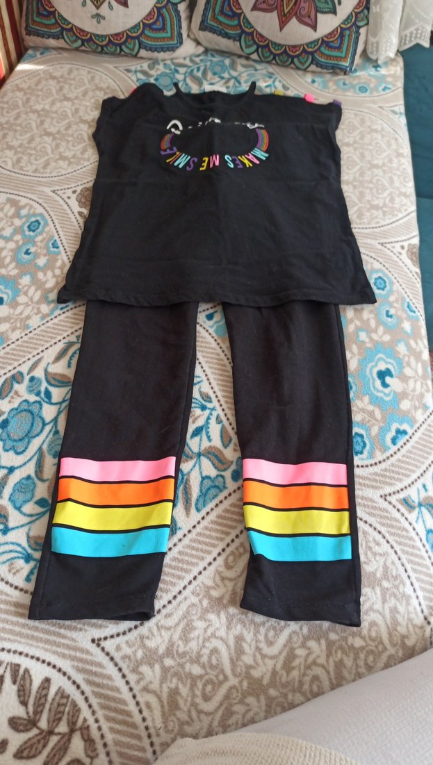 Esnek bel ve bileklerde renkli çizgiler bulunan siyah rahat kesim kız çocuk Taytlı takım sayılı giyilmistir yeni gibi