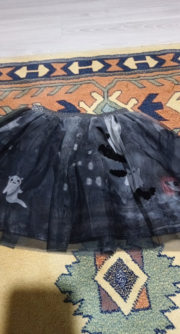 Siyah renkli kız çocuk eteği, bol kesim ve fırfırlı katmanlara sahip. Bağlama desenli, hayalet ve yarasa figürleriyle gotik tarzda. Sentetik kumaştan üretilmiştir.