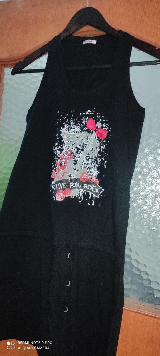 Pamuklu, kolsuz, straplez, bol kesim siyah üst, pul işlemeli rock punk baskı detayına sahiptir.