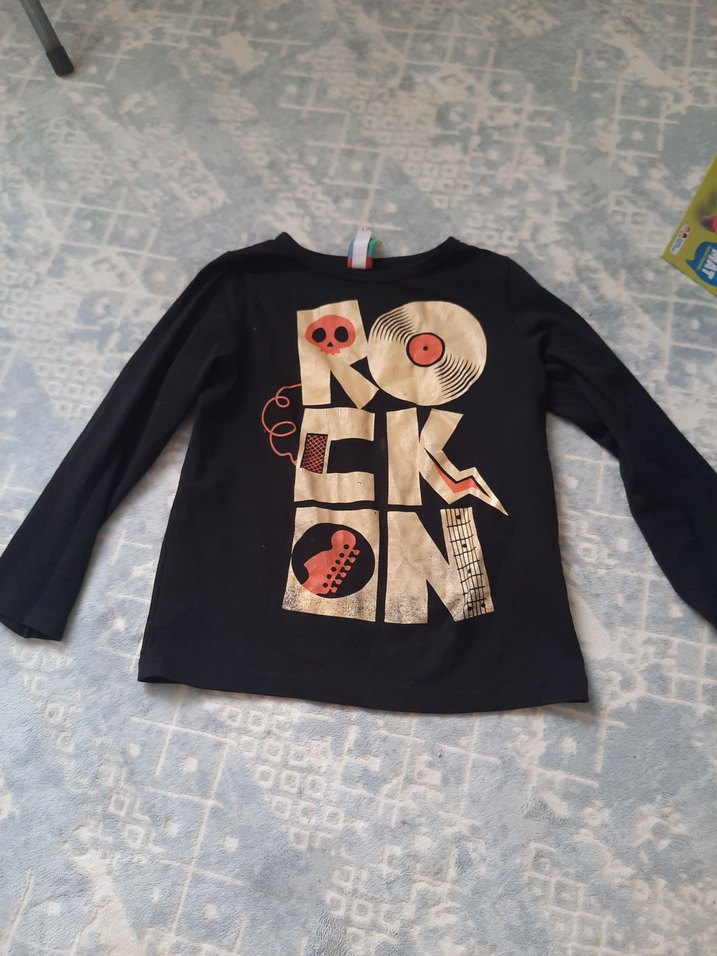 Siyah renkli, uzun kollu kız çocuk tişörtü, bol kesim ve bisiklet yaka. Rock punk baskılı ve düğmeli detaylı, yumuşak ve sıcak kumaştan yapılmıştır.