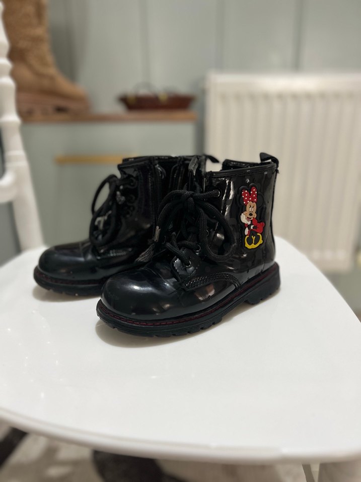 Siyah lastik kız çocuk botları, tokalı ve renkli nakış detaylı, rock punk tarzında.