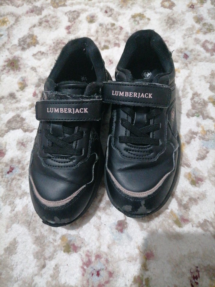 Siyah kız çocuk spor ayakkabısı, tokalı ve kauçuk tabanlıdır. Rock punk havası ve sade tasarımıyla 'LUMBERJACK' markası tokada yer alır.