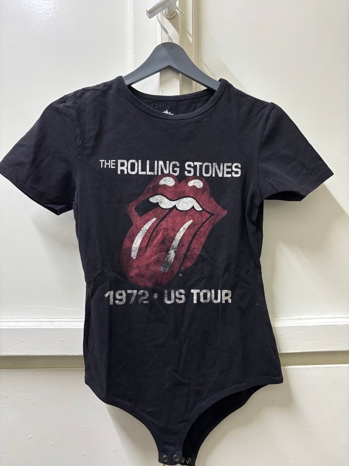 Siyah, kısa kollu, bisiklet yaka, fitted kesim kız çocuk tişörtü. 1972 Rolling Stones US Tour baskılı ve düğmeli detaylı. Keten kumaş.