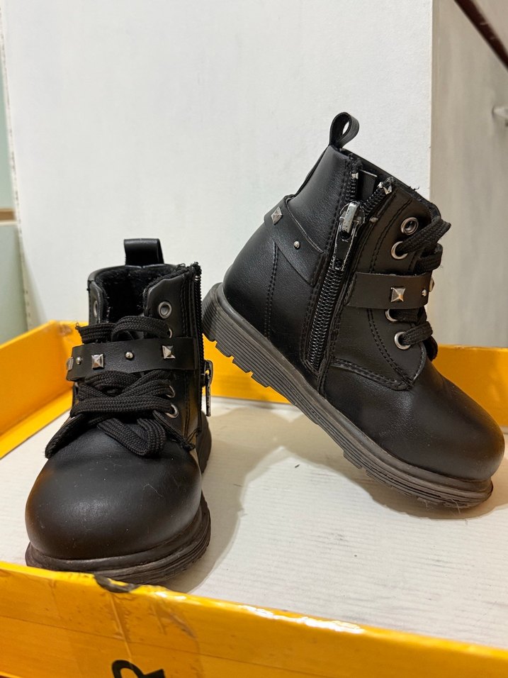Kız çocuklar için tokalı ve fermuarlı siyah kauçuk botlar. Rock punk tarzında, desensiz ve sağlam tabanlıdır.
